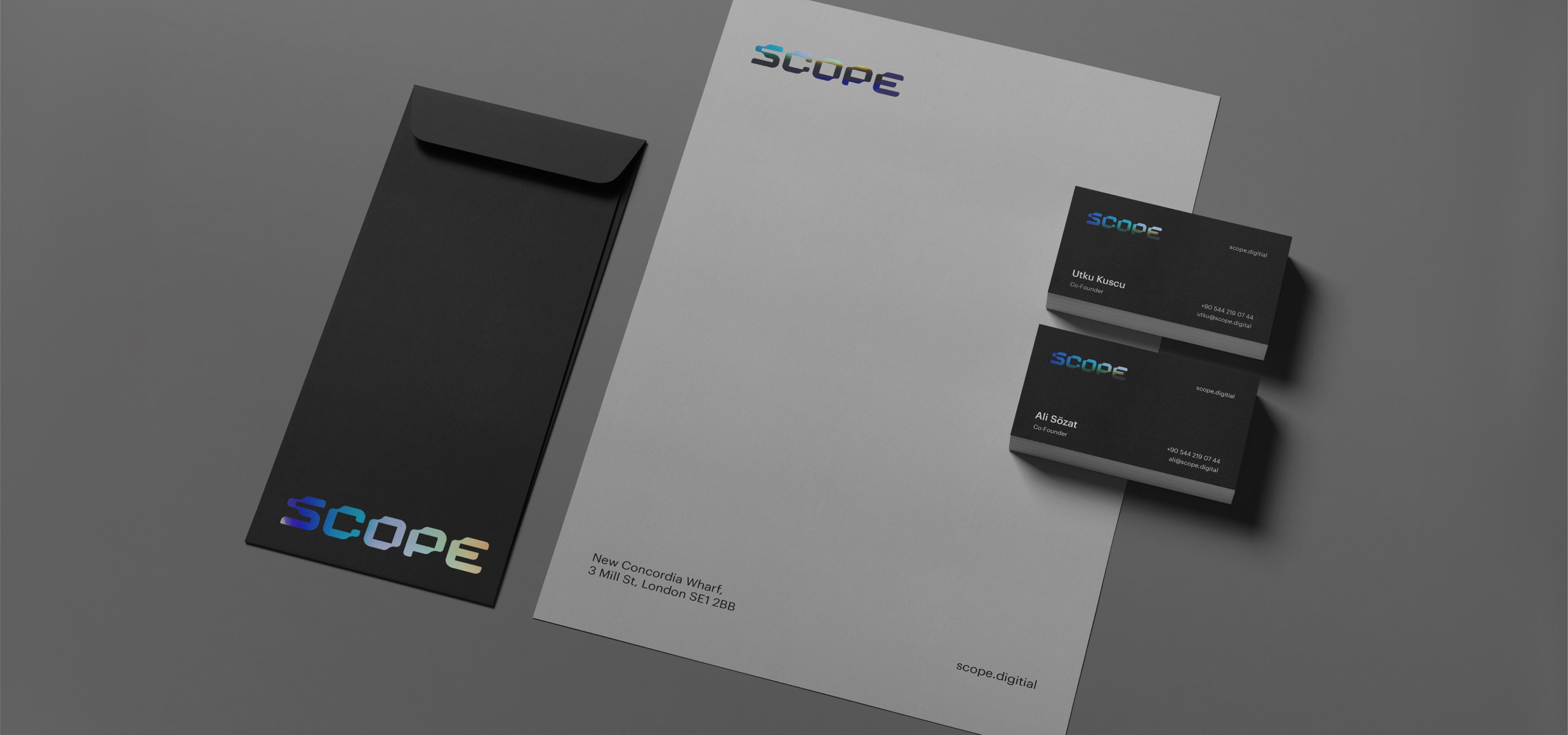 We retired the old logo entirely. No iterations, no "let's keep the spirit of it." The brand was rebuilt from the ground up — a new mark, a refined typographic system, a clean and confident color palette. Once the identity was solid, it went across every touchpoint: business cards, letterheads, pitch decks, print collateral. The website came last, pulling everything into a single coherent experience that finally matches what Scope actually does.